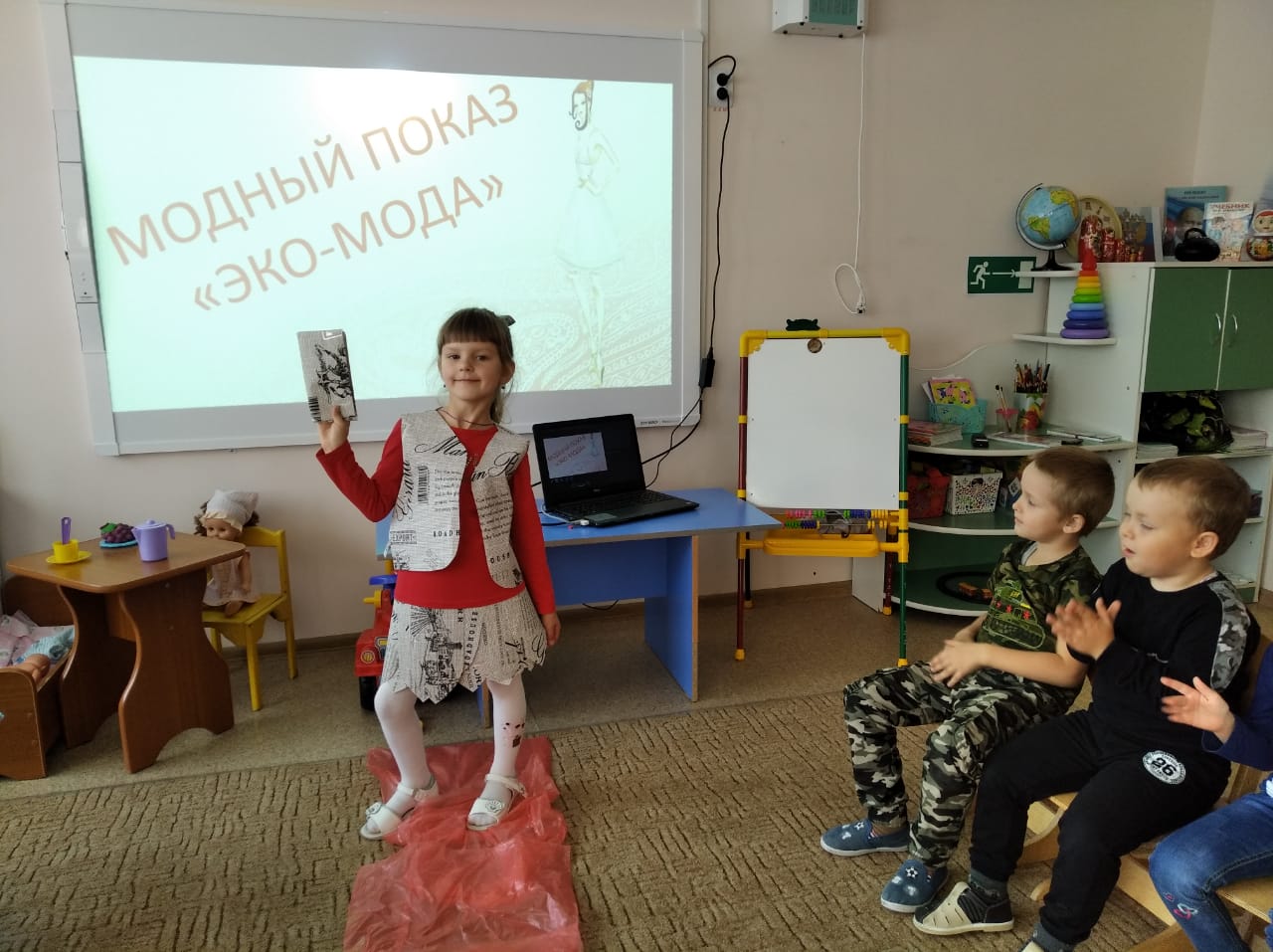 В старшей группе прошла тематическая неделя «Мы чистим мир» под девизом «Наш друг - природа». Дети закрепляли знания детей о природе, о бережном и заботливом отношении к ней, проводили беседы, наблюдения, подвижные и дидактические игры а также шоу «Эко-мода», где каждая модель презентовала свой костюм из мусорных мешков, утеплителя, фольги, картона и т. д. К завершению недели ребята показали театрализованное представление «Лесная сказка» . Где артисты проявили свои творческие способности перевоплотившись в героев лесной сказки. Зрители, погрузившись в сюжет проявляли заинтересованность к мероприятию. Театрализованное представление «Лесная сказка» вызвало чувство сопереживания к природе, как со стороны героев, так и для зрителей.